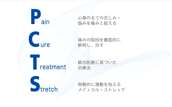 PCTSは、病院で十分な治療が施せない疾患に対し、身体全体(心身)を視野に収めた統合医療によって、疾患の原因を確実に特定し治療を行う、全く新しい治療法です。